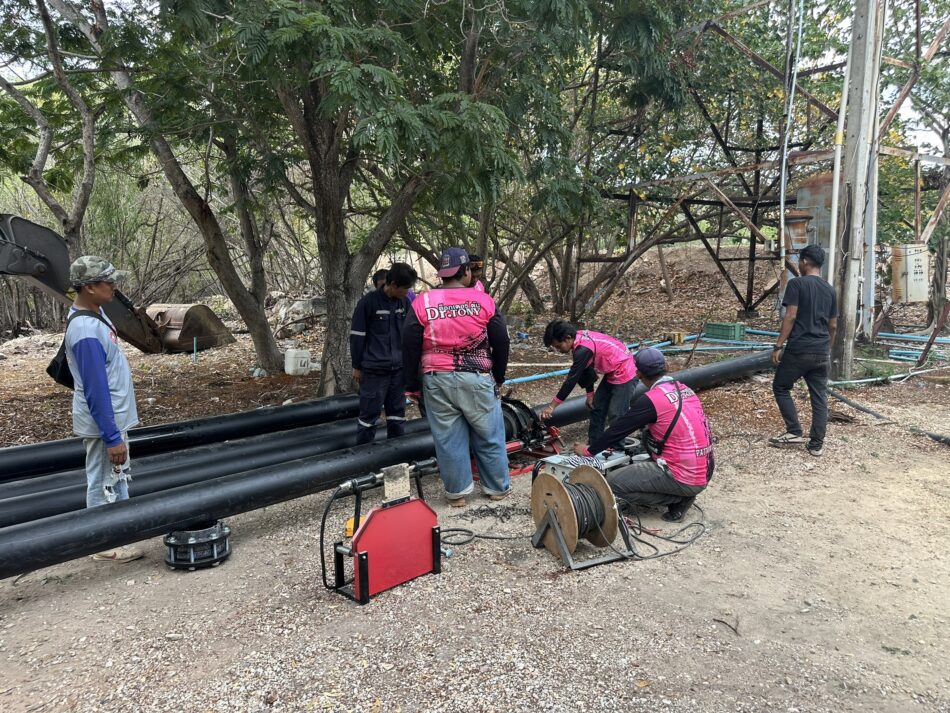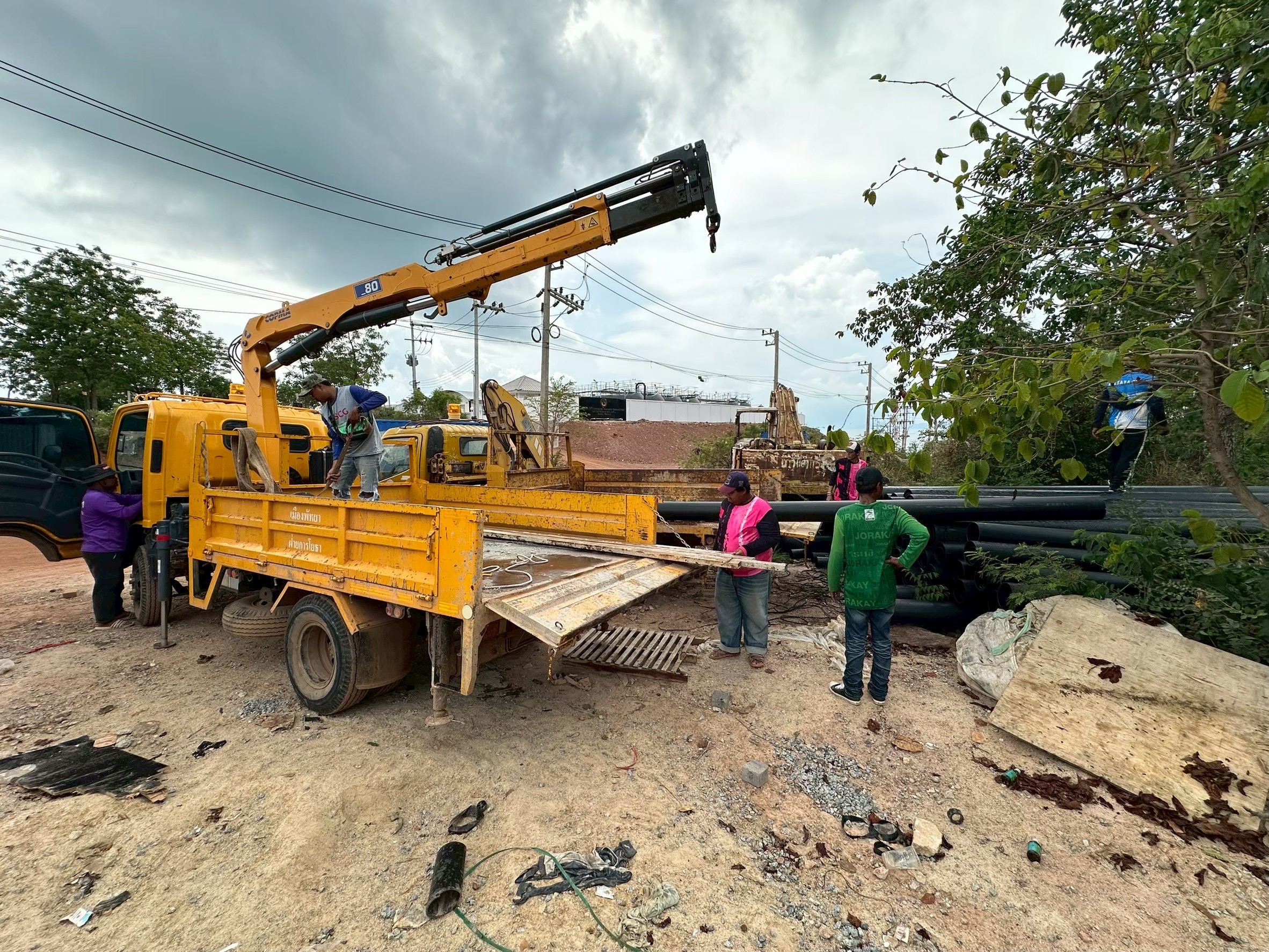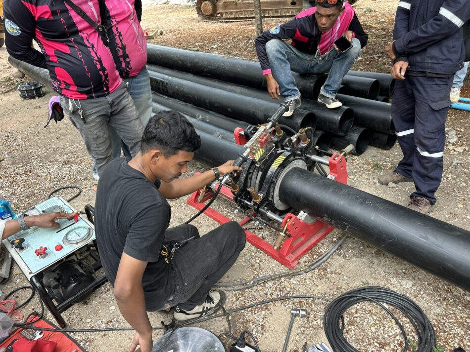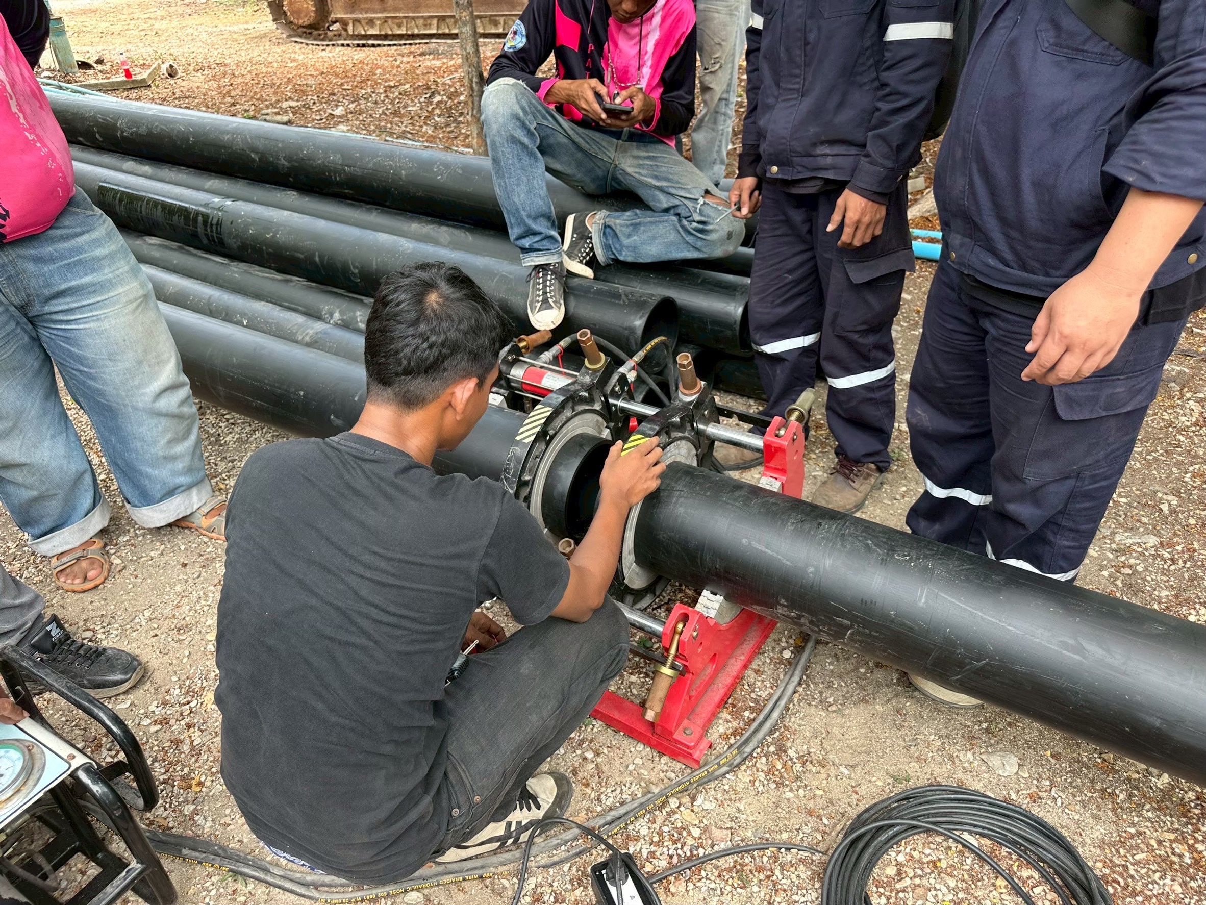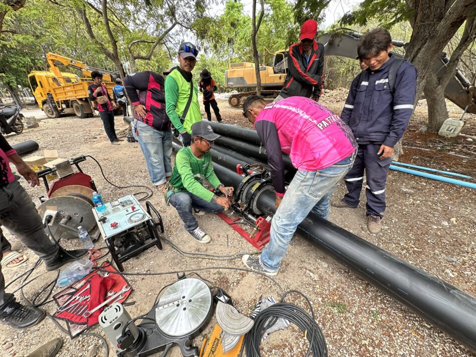 ดำเนินงานจัดส่งท่อ HDPE และอุปกรณ์ประกอบท่อ พร้อมเชื่อมท่อและวางแนวท่อส่งน้ำ เพื่อระบายน้ำไปยังระบบบำบัดน้ำเสีย บริเวณ เกาะแสม–เกาะล้าน เมืองพัทยา โดยตรวจสอบความเรียบร้อยของจุดต่อและแนวท่อให้พร้อมใช้งาน